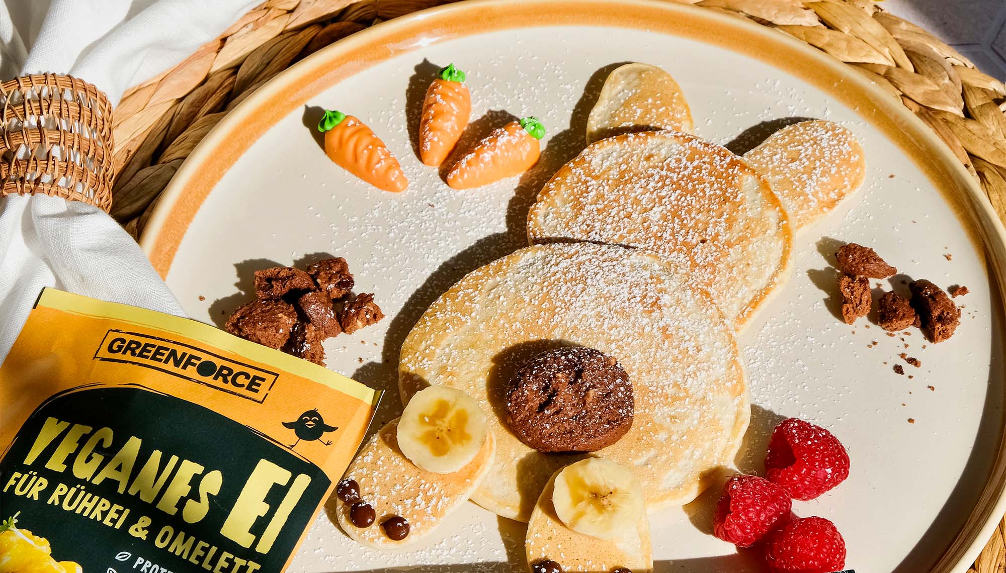 Aus dem Bio Hafer Drink und dem Ei hat GREENFORCE ganz besondere Pancakes backen 😉. Uns läuft das Wasser im Munde zusammen, wenn wir an die wirklich süßen “Häschenpancakes” denken. Diese Pancakes werden mit Sicherheit nicht nur von Kids gern aufgefuttert, damit wirst Du allen ein Lächeln ins Gesicht zaubern. Der Teig ist zackig angerührt. Jetzt nur noch die Pfanne vorheizen und nacheinander das “Häschen” backen. Verziert mit ein bisschen Obst und kleinen Keksen und schon kann das “Osterhäschen” vom Teller hoppeln.